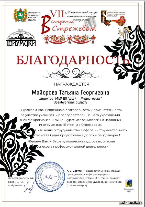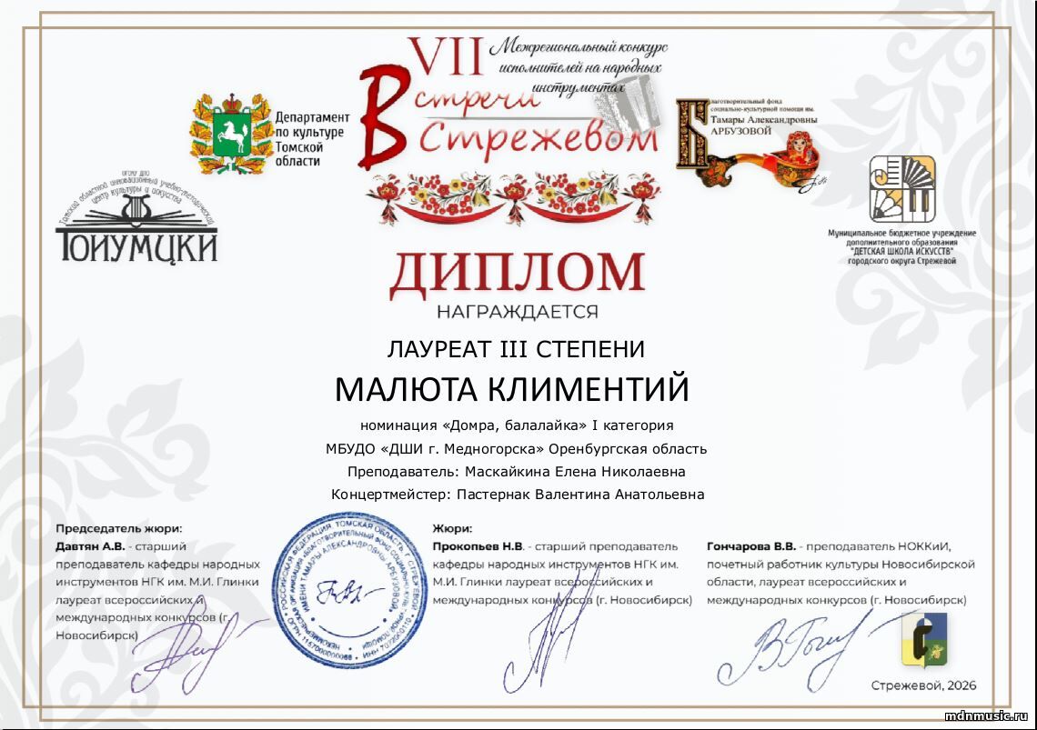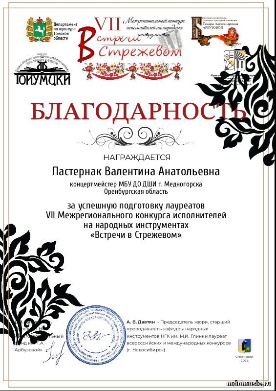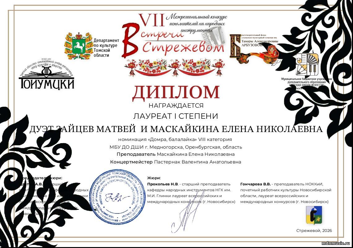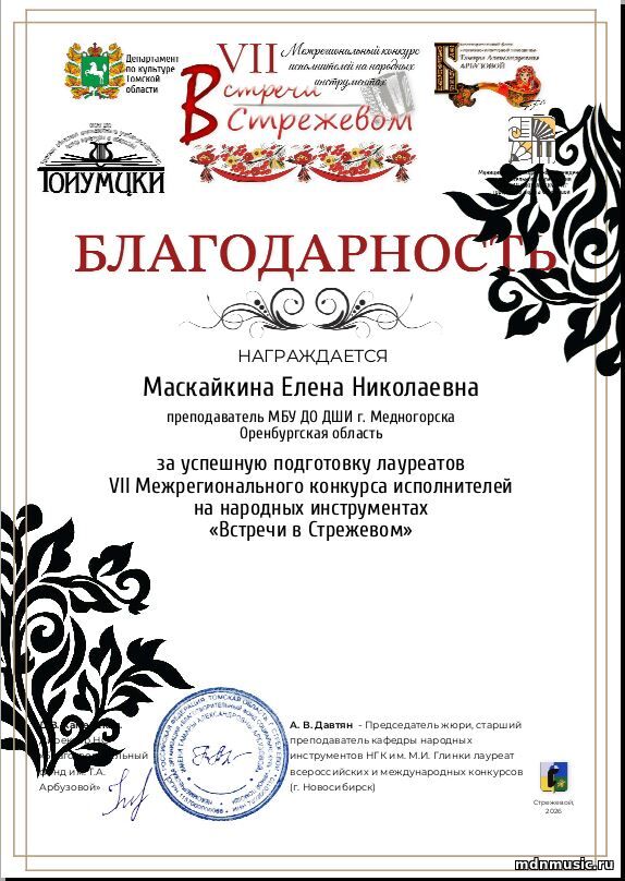 Поздравляем учащихся и преподавателя народного отделения Маскайкину Елену Николаевну, концертмейстер Пастернак Валентина Анатольевна, с блестящей победой в VII Межрегиональном конкурсе исполнителей на народных инструментах «Встречи в Стрежевом», Томская область.