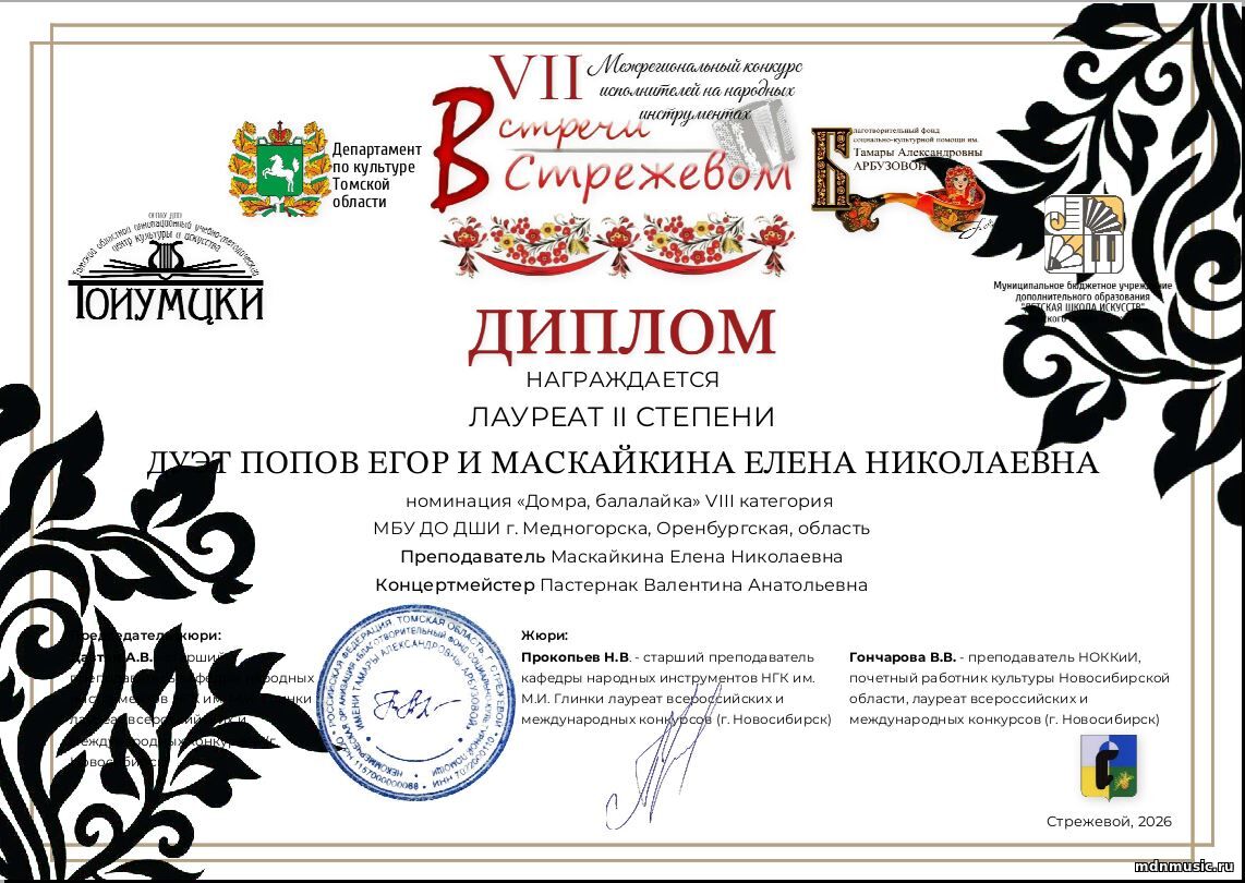 дуэт Попов Егор, Маскайкина Е. Н – лауреат II степени;