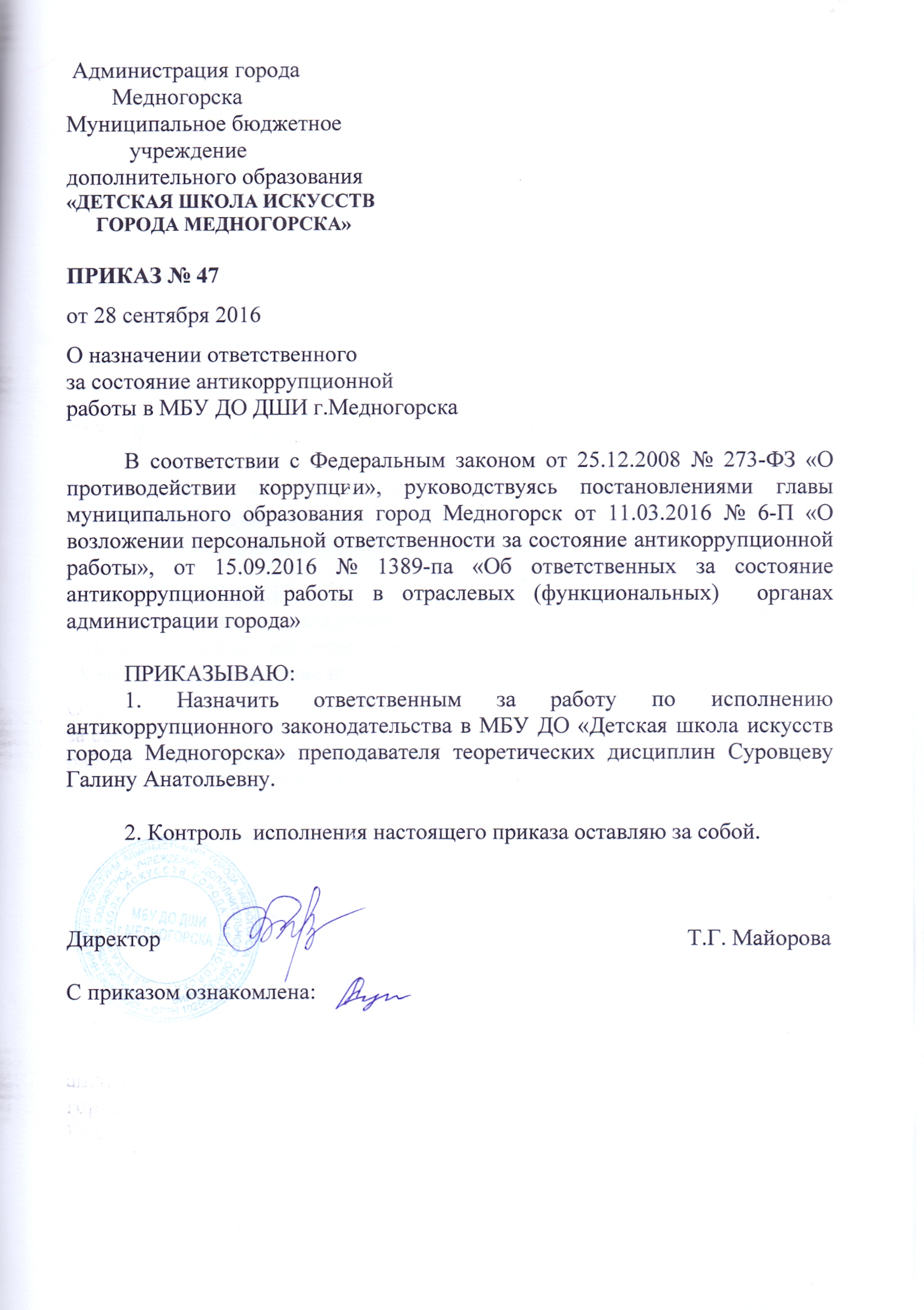 Приказ о назначении ответственного лица
